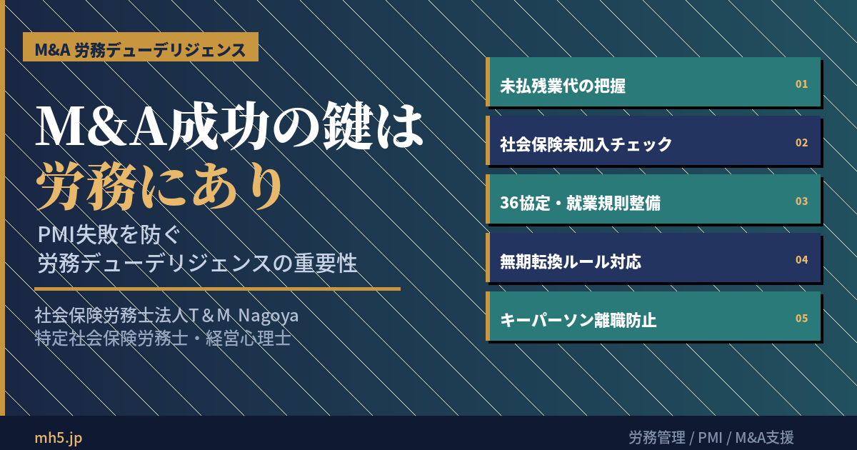 財務的に魅力的な企業でも、従業員が離職してしまえば買収の意味はなくなります。だからこそ、M&Aを成功させるには労務管理に真剣に向き合うことが不可欠です。買収前の労務DDで潜在リスクを洗い出し、統合後は従業員が安心して働き続けられる環境を整える。この取り組みこそが、M&A成功への確実な道です。